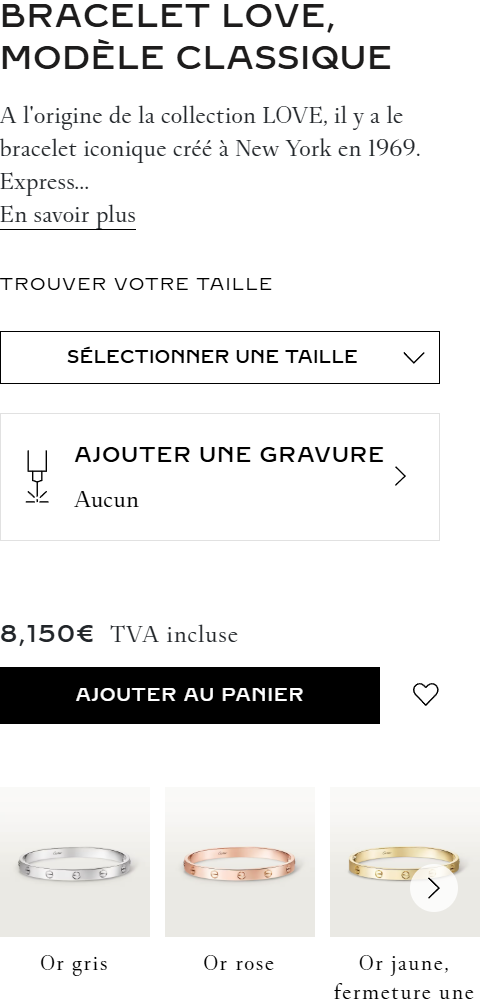 En or jaune, rose ou blanc, parfois sublimé par des diamants, le Cartier Love se prête à toutes les envies et à tous les styles. Porté seul pour une touche minimaliste ou associé à d’autres bijoux pour un effet sophistiqué, il incarne une élégance moderne et sincère.